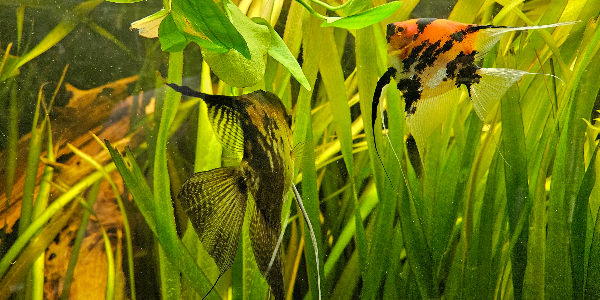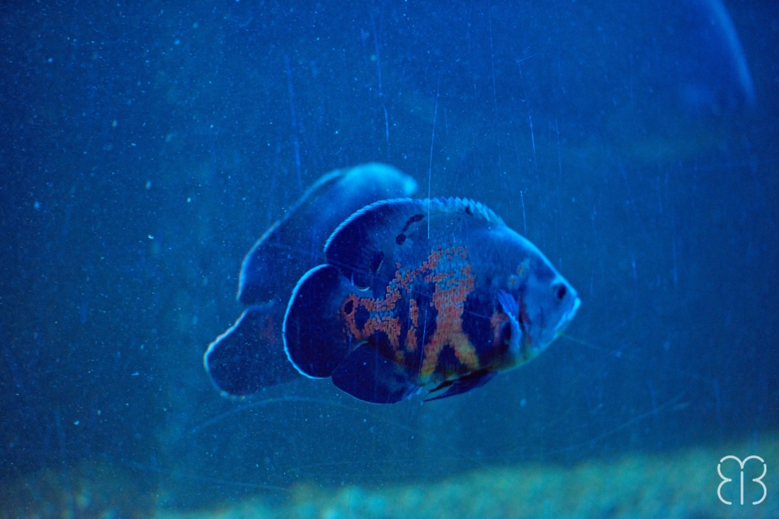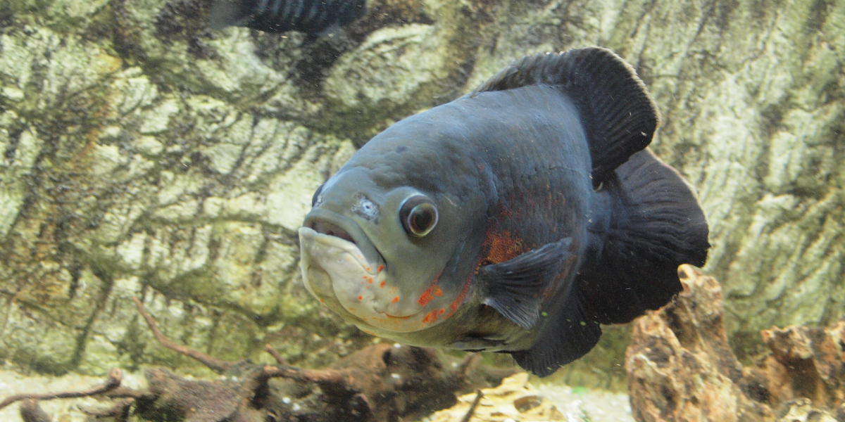 Akvárium doplňují vrubozubci paví (Astronotus ocellatus). Jejich domovinou jsou stojaté nebo pomalu tekoucí vody jihoamerických řek. Jsou to dravé a velmi čilé ryby, které lze chovat jen s podobně velkými rybami schopnými se bránit. Vrubozubci jsou naprosto neúnavnými dělníky při přestavbě akvária. V nádrži neustále něco přehrabují, přemisťují a poškozují rostliny – ani velké kameny jim nedělají velké problémy. Při stresu se položí na dno a dlouhou dobu předstírají, že jsou mrtvé.