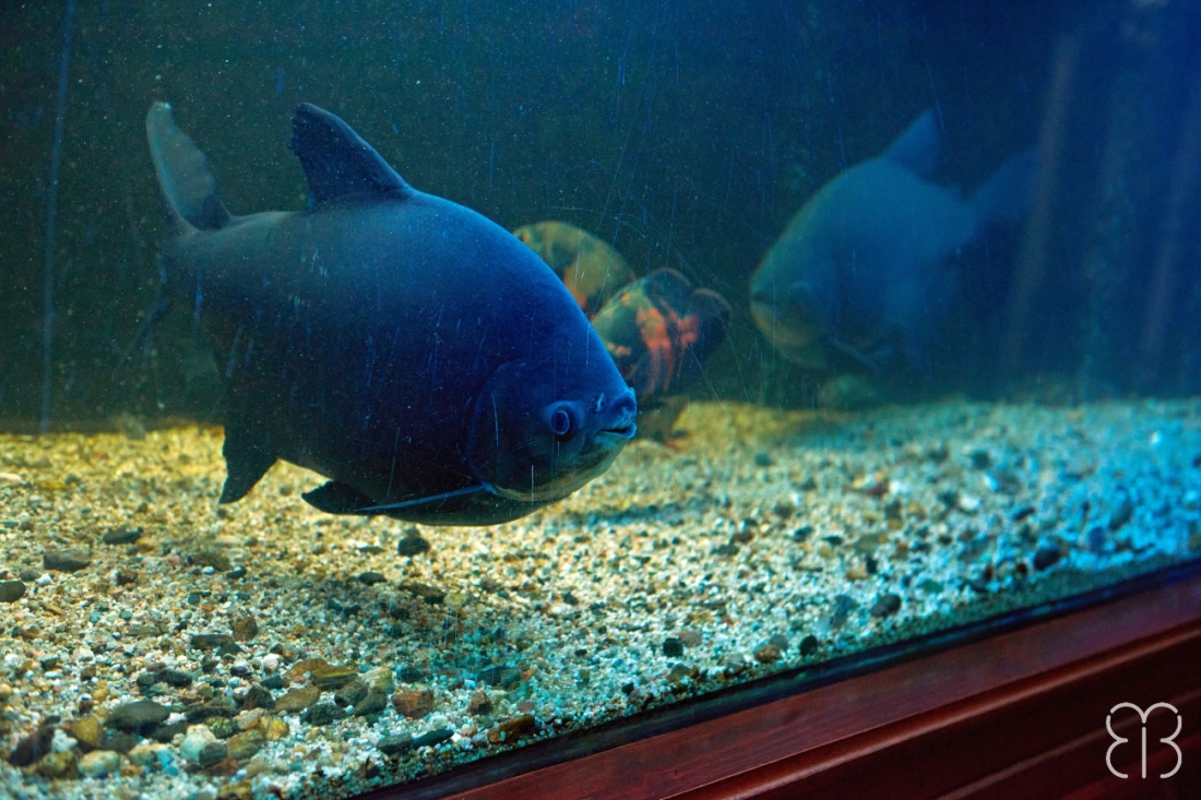 V prostředním akváriu jsou chovány dva jedinci piraně plodožravé (Piaractus brachypomus, syn. Colossoma brachypomum). Piraňa plodožravá patří mezi všežravce – konzumuje zelené krmivo, rybí maso, červy, plody i speciální umělá krmiva. Má velké, silné, ploché zuby, s jejichž pomocí drtí skořápky ořechů či pecky. Pohlaví je velmi těžce zjistitelné. Mladší jedinci mají stříbřitou barvu s červeným břichem, v dospělosti se však jejich zbarvení mění na černé.