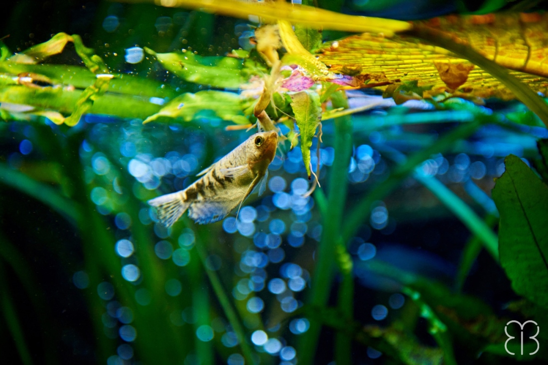 Zvláštní oblibě návštěvníků se těší čichavec perleťový (Trichogaster leeri) se stříbřitě třpytivým tělem a jemným síťováním, ale i zářivě zbarvené formy čichavce šedého (Trichogaster trichopterus) v barevné variantě Gold. Doplňují je čichavec pyskatý (Colisa labiosa) a čichavec pruhovaný (Colisa fasciata), čímž vzniká harmonické a barevně pestré společenstvo. Dynamiku a pohyb do nádrže vnášejí parmičky zlaté (Puntius semifasciolatus), drobné hejno razbor klínoskvrnných (Rasbora heteromorpha) a hravé mřenky (Botia sidthimunki).